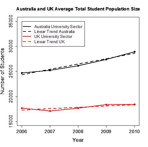 Average Enrolment of Australia and UK Universites Statistical Systems Analytics has conducted a study that compares the student growth of Australian and United Kingdom universities. The Figure shows two lines for each of the sectors. The solid line represents the non-liner growth in average total student population size, while the dashed lines represent the linear growth. Both these lines are close to each other in curvature, which allows for an efficient linear interpretation. Clearly, the rate of growth of the average enrolment in Australia is greater than that of the UK... Data for the analysis has been obtained from the following sources:Source Australia: DIISRTE.Copyright Commonwealth of Australia, reproduce by permission of the Department of Innovation, Industry, Science, Research and Tertiary Education.Source United Kingdom: HESA.Reproduced by permission of the Higher Education Statistics Agency Limited.HESA cannot accept responsibility for any conclusions or inferences derived from the data by third parties.Note: The time series for the UK is in fact from 2006/07 to 2010/11 because the academic year in the UK begins in autumn and ends the following summer. | |